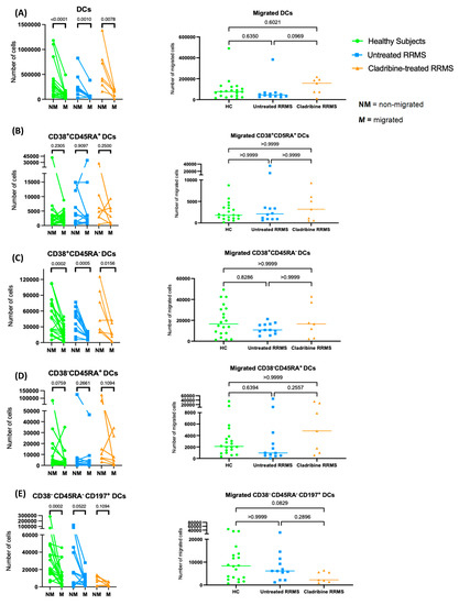 Total DCs did not migrate, and no significant differences in the absolute numbers of migrated DCs were observed across all groups (Figure 3A). Additionally, no definitive transmigratory pattern of CD38+CD45RA+ DCs in healthy subjects and untreated RRMS patients was identified (Figure 3B). The numbers of migrated CD38+CD45RA+ DCs were similar across the three groups (Figure 3B). Similarly, CD38+CD45RA− DCs did not migrate across groups (Figure 3C), with no difference in migrated numbers (Figure 3C). CD38−CD45RA+ DCs did not show a migratory pattern in any group (Figure 3D), and the total numbers of migrated CD38−CD45RA+ DCs were similar in the three groups (Figure 3D). Likewise, there was no migration of CD38−CD45RA−CD197+ DCs in all groups, but healthy subjects had significantly lower numbers of migrated than non-migrated cells (Figure 3E). However, the absolute numbers of migrated cells in this subset tended to be lower in cladribine-treated than in untreated RRMS patients and healthy subjects, without reaching significance (Figure 3E).