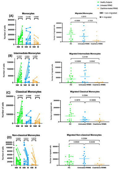 Total monocytes actively migrated in healthy subjects, but not in untreated and oral-cladribine-treated RRMS patients (Figure 4A). There was no significant difference between the absolute numbers of migrated monocytes in healthy subjects and untreated and cladribine-treated RRMS patients (Figure 4A). Intermediate monocytes significantly migrated in both healthy subjects and untreated RRMS patients. In contrast, intermediate monocytes lost their active migration in cladribine-treated RRMS patients (Figure 4B). Absolute numbers of migrated intermediate monocytes were lower in cladribine-treated RRMS patients compared to in untreated RRMS patients (Figure 4B).