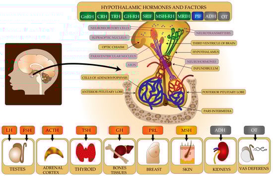 The hypothalamus plays an overarching role in endocrine regulation by synthesizing and secreting numerous neurohormones [20]. Hypothalamic neurons produce and release into the pituitary portal circulation the following hormones: gonadoliberin (GnRH), corticoliberin (CRH), thyrotropin-releasing hormone (TRH), hormones that regulate growth hormone release (somatoliberin (GH-RH), somatostatin (SRIF)), hormones that regulate melanocyte-stimulating hormone (MSH-RH, MRIH), and prolactin-inhibiting factor (PIF) (dopamine). Hypothalamic neurons also have the ability to produce antidiuretic hormone (ADH) and oxytocin (OC). They are produced in the cell bodies of neurons within supraoptic and paraventricular nuclei and then transported along the axons to the posterior lobe of the pituitary gland where they are accumulated [21].