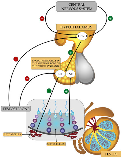 Numerous simple and complex neural, hormonal, and metabolic mechanisms are involved in the regulation of the HPG axis. GnRH release is regulated by the CNS and ANS [30,31]. For example, the neuropeptide kisspeptin has the ability to bind to KISS1R receptors on GnRH neurons. This stimulates the release of GnRH and gonadotropins [32,33]. The neurotransmitters, glutamate and noradrenaline, stimulate the HPG axis, whereas GABA inhibits it [27]. Hormonal regulation involves the direct action of hormones on the axis, causing stimulation or inhibition of the release of another hormone. An increase in serum testosterone levels causes, by feedback, a decrease in the secretion of GnRH, LH, and FSH. On the other hand, when the serum testosterone levels are too low, the release of GnRH, LH, and FSH is increased in a healthy man [34,35]. Testosterone can be converted to estradiol under the influence of aromatase in tissues. Estrogens inhibit the secretion of GnRH, LH, and FSH [36,37]. Sertoli cells produce inhibin. Inhibin B inhibits the release of FSH [38]. Hormone secretion is also influenced by direct metabolic substrates or products (metabolic regulation) [39].