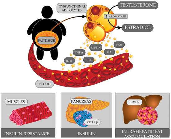 Obese men have an excessive amount of adipose tissue that exhibits metabolic and endocrine activity (Figure 3). In adipocytes, there is an increase in the expression of aromatase, which converts testosterone to estradiol [179]. Increased levels of estradiol affect the HP axis, and, through a negative feedback mechanism, reduce the secretion of GnRH and LH, which consequently leads to insufficient stimulation of Leydig cells to produce testosterone [180].