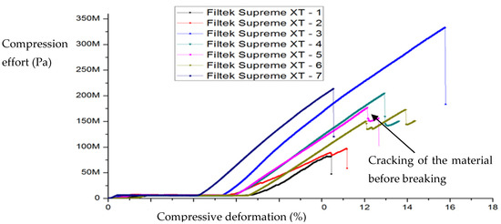 Although the data given in the literature for compressive strength vary within very wide limits, it is unanimously accepted that all mechanical properties (compressive strength, diametral strength, flexural strength) are better for Filtek Z250 hybrid composite than for Filtek Supreme XT nanocomposite [9,10,11,12]. Both materials have the same polymer matrix and similar particle loadings but different particle sizes. Therefore, a possible explanation for these properties lies in the different propagation mechanisms of microcracks during deformation. Thus, it can be seen that the micrometer particles of the Filtek Z250 block crack propagation and reflection, while the nanometer particles allow it. In fact, the curves in Figure 1 and Figure 2, through the regions marked with dotted lines, indicate stronger cracking of Filtek Supreme XT composite than Filtek Z250 composite before breakage.