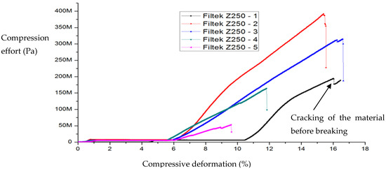 Table 1 shows that there are widely dispersed values for both types of material. This is because the existence of internal defects in the materials can lead to the formation of micro voids that weaken the compressive strength. Thus, it was found that very good pressing prior to light curing in the fluid state leads to compact specimens with high strength. In this context, we will note only the maximum values obtained by us, 333 MPa for Filtek Supreme XT and the higher 392 MPa for Filtek Z250. We also note that at the test speeds used, 0.5, 1, and 1.5 mm/min, no significantly different results were obtained.