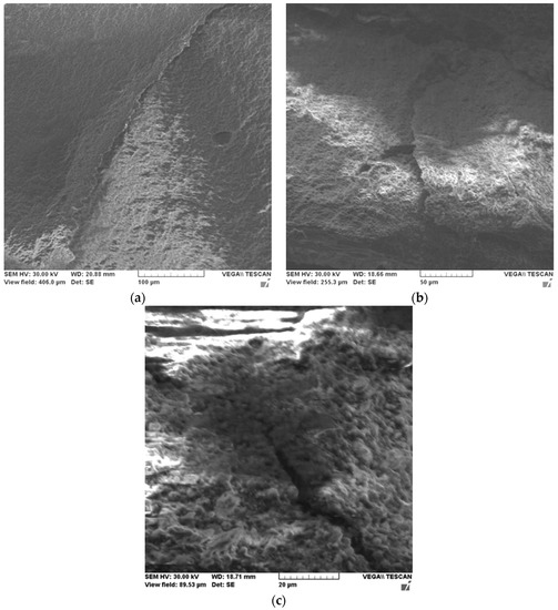 After the mechanical tests, the samples were investigated by SEM microscopy to identify the causes of breakage and the mode of propagation of microcracks. Such experimental studies have been performed on other materials and employed other types of mechanical “efforts” (see, for example, [23,24]).