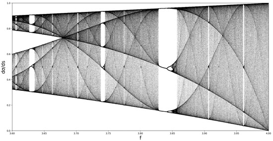 It is possible to highlight the otherwise well-known fact of nonlinear dynamics [17,18] that the increase in the logistic map parameter after 3.56995 leads to chaos. This means that between roughly 3.6 and 4 , there are complex chaotic dynamics; in our case, it means that the variation of f between 3.6 and 4 leads to repeated ordered-chaotic dynamics transition for d σ d s . Practically, because of the nature of this mapping, there are order-disorder transitions in dental composite materials dynamics, wherein f is the control parameter (see Figure 7).