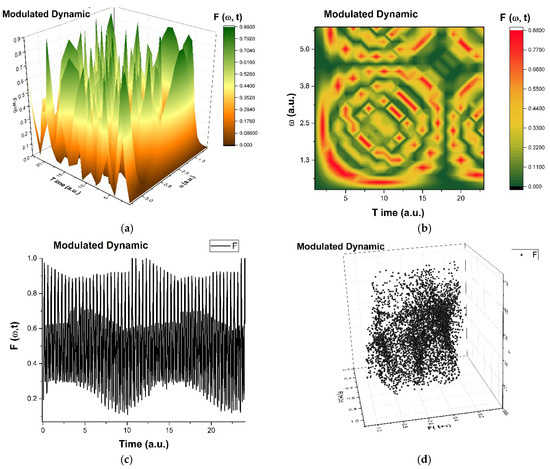 Figure 8. (ad): The ”modulated dynamic modes” in mastication of the structural units of dental composite materials dynamics are presented: (a)—3D diagram, (b)—contour diagram, (c)—time series and (d)—reconstituted attractor for scale resolutions given by Ωmax.