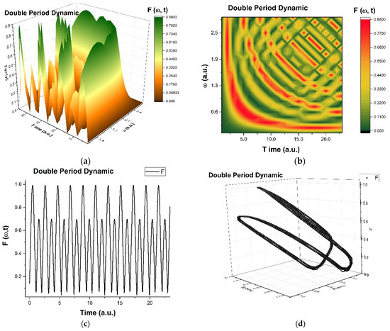 Figure 9. (ad): The ”double period dynamic modes” in mastication of the structural units of dental composite materials dynamics are presented: (a)—3D diagram, (b)—contour diagram, (c)—time series and (d)—reconstituted attractor for scale resolutions given by Ωmax.