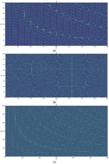 Figure 10. (a): Example of 2D plot fracture patterns by means of h Ω , t , maximum at 200; Φ = 2.35 . (b): Example of 2D plot fracture patterns by means of h Ω , t , maximum at 400; Φ = 2.35 . (c): Example of 2D plot fracture patterns by means of h Ω , t , maximum at 600; Φ = 2.35 .