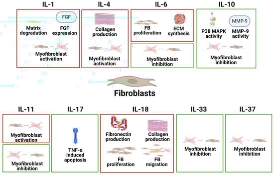 Fibroblasts are the most abundant cell type found in connective tissue and are responsible for secreting collagen proteins that provide a structural framework for many tissues. Additionally, fibroblasts play an important role in wound healing. In heart disease, however, fibroblasts are transdifferentiated into activated myofibroblasts, which express α-smooth muscle actin (ACTA2) and secrete extracellular matrix (ECM) proteins and are a defining feature of fibrosis. The specific effects of different interleukins on FBs in common heart disease are summarized in Figure 2.