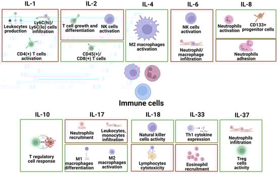 Immune cells are implicated in the pathophysiology of heart diseases and include several types of cells in the heart, such as T cells, B cells, macrophages, neutrophils, and NK cells. The specific effects of different interleukins on these immune cells in common heart disease are summarized in Figure 4.