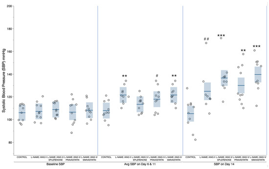 Each circle represents systolic blood pressure (SBP) for an animal. Data are presented as mean ± SEM. Data were analyzed by one-way ANOVA with subsequent pair wise comparison (Tukey–Kramer HSD) between treatment groups. Each of the following time points were analyzed separately; baseline blood pressure, average of day 6 and 11 blood pressure, and day 14 blood pressure. p values for comparison with the control group (Tukey–Kramer HSD) are as follows: ✭✭ p < 0.01; ✭✭✭ p < 0.001; # p = 0.06, ## p = 0.07.