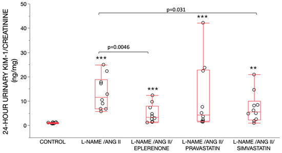Day 14, 24-h urinary KIM-1/creatinine ratios (ng/mg). Data are shown as box plots (minimum value, first quartile, median, third quartile, and maximum value). The lines are superimposed in the control group. There were significant differences between the five treatment groups (p < 0.0001) by Wilcoxon/Kruskal Wallis (Rank sums) test. Nonparametric pairwise comparisons were performed using Wilcoxon method. There was a significant increase in day 14 urinary KIM-1/creatinine ratio (ng/mg) in all L-NAME/ANG II groups as compared with the control group (✭✭ p < 0.01, ✭✭✭ p < 0.001). Day 14 urinary KIM-1/creatinine ratio (ng/mg) was significantly lower in L-NAME/ANG II groups receiving eplerenone (p = 0.0046) and simvastatin (p = 0.031) as compared with the L-NAME/ANG II group.