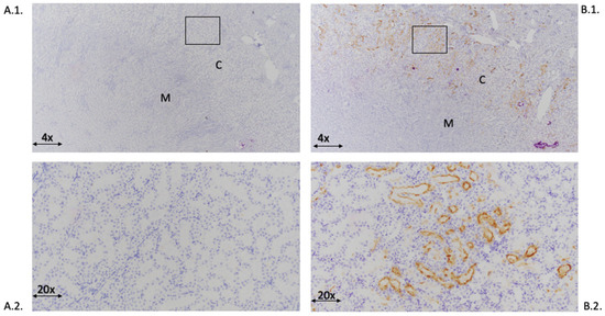 Immunostaining of KIM-1 in kidneys from a control treated animal (A.1.,A.2.) and L-NAME/ANG II treated animal (B.1.,B.2.). (A.1.) shows minimal to no KIM-1 immunostaining. B.1 shows KIM-1 immunostaining of proximal renal tubules. Boxes indicated the area in (A.1.) magnified in (A.2.) and the area in (B.1.) magnified in (B.2.). (A.1.,B.1.) 4× magnification, (A.2.,B.2.) 20× magnification. C indicates the renal cortex and M indicates the renal medulla.