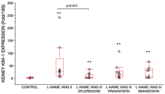 All L-NAME/ANG II groups had higher KIM-1 mRNA expression in renal cortex as compared with the control group (Figure 6). KIM-1 mRNA expression was significantly lower in L-NAME/ANG II group receiving eplerenone (p = 0.012), as compared with the L-NAME/ANG II group (Figure 6).