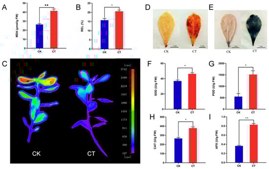 The physiological and biochemical indexes of A. nanus seedlings under cold stress. (A) The content of MDA. (B) REL values. (C) Delayed fluorescence images of the CK and CT. (D) DAB staining shows the site of H2O2 accumulation in leaves under cold stress. The darker the color, the more H2O2 is accumulated. (E) NBT staining shows the site of O2− accumulation in A. nanus leaves under cold stress. The darker the blue color, the more O2− is accumulated. (F) The enzyme activities of SOD. (G) The enzyme activities of POD. (H) The enzyme activities of CAT. (I) The enzyme activities of APX. Each experiment was performed in three independent biological replicates. Values are expressed as means ± SD (n = 3), and the statistically significant differences were evaluated using Student’s t-test, * p < 0.05, ** p < 0.01.