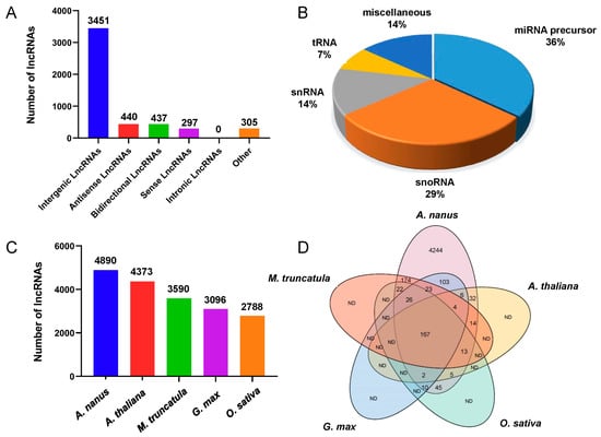 Identification of lncRNAs in A. nanus. (A) Classification of the lncRNAs identified in A. nanus according to the locations in the genome. (B) Housekeeping ncRNA and miRNA precursors predicted from the six libraries. (C) Number of lncRNAs identified from A. nanus, G. max, M. truncatula, A. thaliana, and O. sativa. (D) The Venn diagram analysis of lncRNAs identified from A. nanus with those identified from G. max, M. truncatula, A. thaliana, and O. sativa. ND, the number of lncRNAs were not determined.