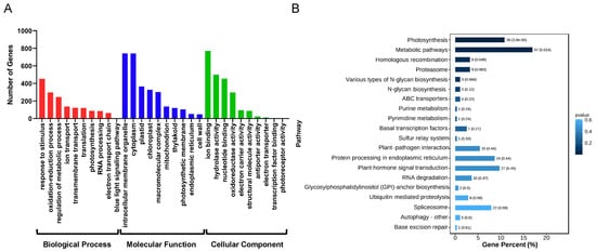 Long non-coding RNA can affect the transcription of nearby protein-coding genes. In A. nanus, a total of 3423 lncRNAs were found to potentially act in cis on 4728 protein-coding genes and formed 6211 cis-regulated lncRNA–mRNA pairs (Table S3). The GO enrichment analysis of these targets revealed the potential roles of the cis-acting lncRNAs in the growth, development, and stress response in A. nanus (Figure 3A). These targets were assigned to 221 GO biological process categories, 41 cellular component categories, and 114 molecular function categories. The top three enriched biological process terms were the oxidation-reduction process (GO: 0055114), regulation of metabolic process (GO: 0019222), and response to chemical (GO: 0042221). For the cellular component, intracellular membrane-bounded organelle (GO: 0043231), cytoplasm (GO: 0005737), and plastid (GO: 0009536) were the three most enriched GO terms. For the molecular function, ion binding (GO: 0043167), hydrolase activity (GO: 0016787), and nucleotide binding (GO: 0000166) were the top three enriched terms. The KEGG enrichment analysis showed that 37 pathways might be affected by these cis-acting lncRNAs, including photosynthesis, metabolic pathways, and homologous recombination (Figure 3B).