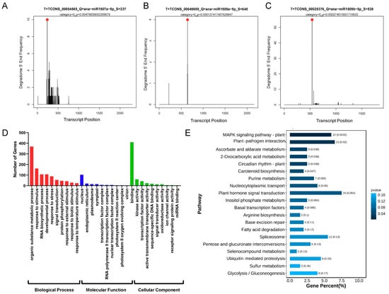 T-plots of target lncRNAs of the miRNAs and functional analysis of target mRNAs of the miRNAs affected by lncRNAs. (A) T-plots of ana-miR1507a-5p-TCONS00054565. The red dot indicates the cleavage site. (B) T-plots of ana-miR1509a-5p-TCONS00049699. The red dot indicates the cleavage site. (C) T-plots of ana-miR1509b-5p-TCONS00025376. The red dot indicates the cleavage site. (D) GO term classification of targets. The x-axis indicates GO terms, and y-axis indicates the number of genes. The red bar charts represent the biological process, the blue bar charts indicate the molecular function, and the green bar charts represent the cellular component. (E) KEGG pathways analysis of targets (top 20). The x-axis represents the percentage of genes, and the y-axis indicates the pathways.