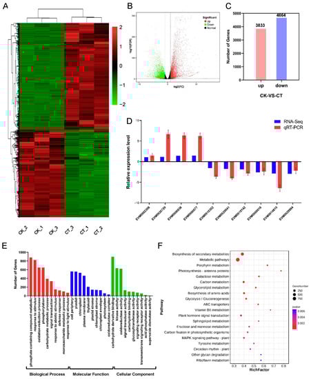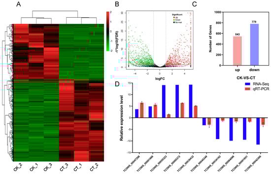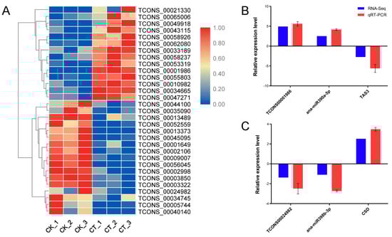 By comparing the abundance of each lncRNA in the CK and CT, a total of 1322 differentially expressed lncRNAs were identified, including 543 up-regulated and 779 down-regulated lncRNAs (Figure 5A–C). To confirm the differential expression of the lncRNAs calculated using the RNA-seq data, 10 lncRNAs were randomly selected for qRT-PCR analysis. The expression pattern revealed using qRT-PCR for each lncRNA was similar to that of the RNA-seq, indicating that the differentially expressed lncRNAs identified using the RNA-seq data were reliable (Figure 5D).