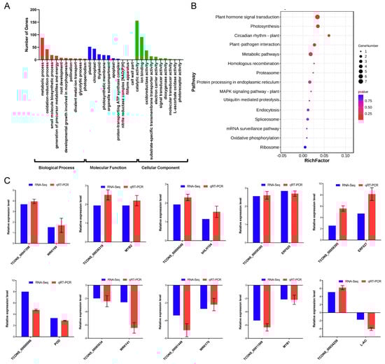 Functional analysis of cis-regulated lncRNA–mRNA pairs related to cold response. (A) GO classification of mRNAs. The x-axis indicates GO terms, and y-axis indicates the number of genes. The red bar charts represent the biological process, the blue bar charts indicate the molecular function, and the green bar charts represent the cellular component. (B) KEGG pathway analysis of mRNAs (top 20). The x-axis represents the percentage of genes, and the y-axis indicates the pathways. (C) qRT-PCR verifies the expression patterns of 10 cis-regulated lncRNA–mRNA pairs under cold stress.