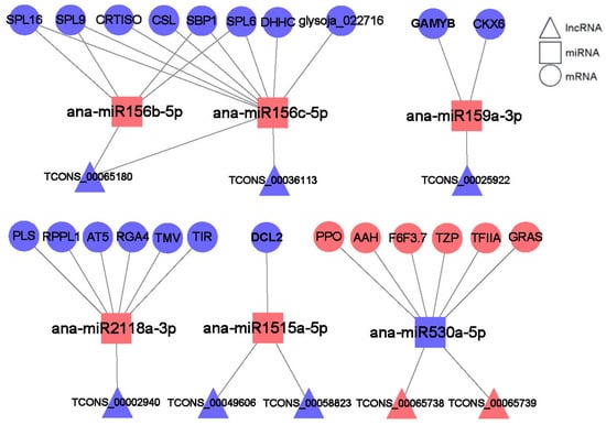 lncRNA–miRNA–mRNA networks involved in the cold stress response in A. nanus. lncRNAs are represented by triangles, miRNAs by squares, and mRNAs by circles. Red represents up-regulated expression pattern and blue represents down-regulated pattern.