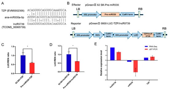 Dual-luciferase reporter assay demonstrates that the lncR5739 and TZP gene is targeted by miR530. (A) Binding sites of miR530 on lncR5739 and TZP as predicted by psRNA target. (B) Dual-luciferase reporter vector construction. (C) The ratio of LUC/REN in the 62 SK + TZP and pre-miR530 + TZP cells. (D) The ratio of LUC/REN in the 62 SK + lncR5739 and pre-miR530 + lncR5739 cells. (E) Values are expressed as means ± SD (n = 3), and the statistically significant differences were evaluated using Student’s t-test, * p < 0.05. qRT-PCR analysis of the lncR5739, TZP, and miR530. The y-axis shows the relative expression with U6 or actin as the internal reference. Data are averaged over three technical replicates.