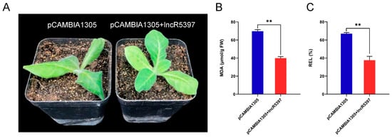 Phenotype analysis of transient overexpression of lncR5739 in tobacco infiltrated by Agrobacterium tumefaciens. (A) The growth state of the control and tobacco plants overexpressing lncR5739. (B) The content of MDA. (C) REL values. Values are expressed as means ± SD (n = 3), and the statistically significant differences were evaluated using Student’s t-test: ** p < 0.01.