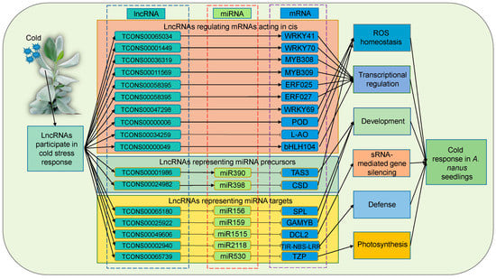 Together, the GO and KEGG analyses of all mRNAs regulated by lncRNAs revealed that A. nanus lncRNAs played regulatory roles in the cold stress response by modulation of the biological processes including ROS homeostasis, transcriptional regulation, development, sRNA-mediated gene silencing, defense, and photosynthesis (Figure 12).