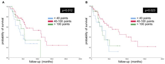 Kaplan-Meier survival analysis revealed a significantly better OS (p < 0.012) and PMS (p < 0.023) for the 58% of patients with PINK1 immunoexpression in CRCs tested, which were in ranges comparable to the colon mucosa (mean OS: 103.6 ± 12.9 months; mean PMS: 86.1 ± 11.9 months). On the other hand, samples with values either under 40 points or above 100 points of PINK1 highlighted a significantly worse OS (Score < 40 points = mean OS: 49.2 ± 8.6 months; Score > 100 points = mean OS: 62.0 ± 11.0 months) and PMS (Score < 40 points = mean OS: 33.4 ± 5.9 months; Score > 100 points = mean OS: 38.7 ± 7.1 months) (Figure 2). Survival analysis of PINK1 immunoexpression performed on CRLM samples did not show significant results.