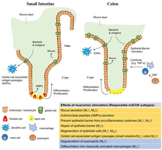 Overall, mAChRs contribute to intestinal epithelial homeostasis by preventing the entry of macromolecules and bacteria into the epithelium via the release of mucus and AMPs.