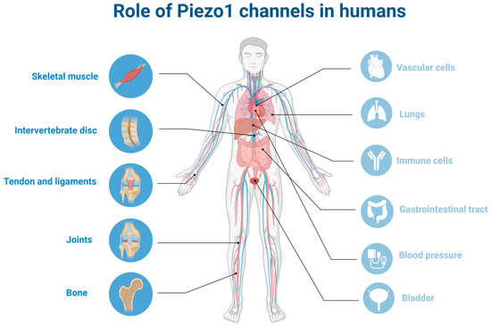 Role of Piezo1 channels in humans: localization of Piezo1 in different organs focusing on musculoskeletal system (the figure was created using biorender.com, accessed on 23 March 2023.).
