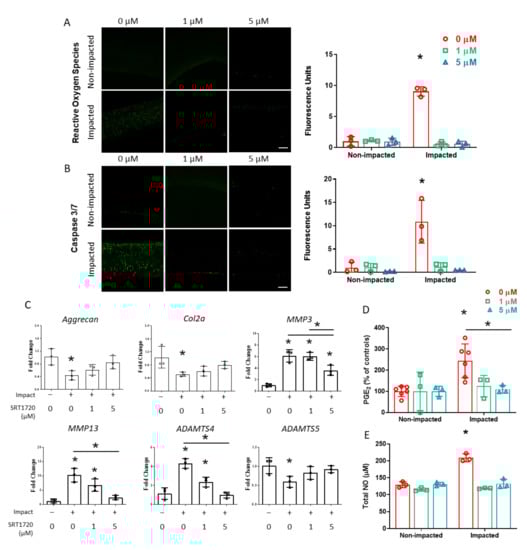 To determine the involvement of SIRT1 in oxidative stress following an impact injury, cartilage explants were fluorescently stained for ROS. Impacted and non-impacted cartilage explants were treated with SRT1720, beginning 30 min before the mechanical overload or exposed to a vehicle control (DMSO). Confocal image analysis of ROS staining indicated a 7-fold increase in untreated explants 24 h post-impact. The treatment of impacted cartilage with 1 and 5 µM SRT1720 decreased ROS staining to levels that were comparable to non-impacted cartilage (Figure 3A). In addition, activated caspase 3/7, an early marker of apoptosis, was visualized in the cartilage explants by fluorescent staining. Caspase 3/7 staining increased substantially 24 h post-impact in untreated explants compared to non-impacted controls. Treatment with 1 and 5 µM SRT1720 prevented activation of the apoptotic pathway and reduced apoptotic signaling to that of non-impacted specimens (Figure 3B).