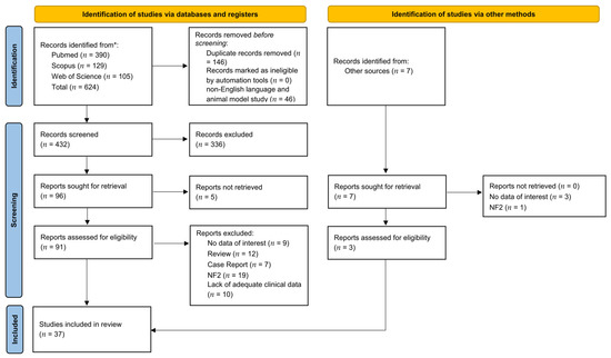 A total of 624 titles were collected from our literature search. After duplicates removal and exclusion of 336 records due to coherence with the inclusion/exclusion criteria, 103 articles relevant to the topic were examined. Five records were unavailable for retrieving. Ninety-four articles were assessed for eligibility, and, in the end, 37 were included in the review [21,22,23,24,25,26,27,28,29,30,31,32,33,34,35,36,37,38,39,40,41,42,43,44,45,46,47,48,49,50,51,52,53,54,55,56,57]. A detailed flowchart of the search process is shown in Figure 1. Available data in the included manuscripts were inadequate to perform a quantitative analysis.