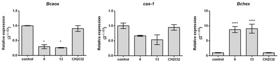 The transcript expression of genes Bcaox, Cas-1, and Bchex in the spores of B. cinerea after the application of derivatives (9) and (13). The relative transcript expressions were analyzed by real-time PCR. The unity value of relative expression corresponds to nontreated samples. All data represent the means of three independent replicates ± SD (n = 9). The significance of the difference was analyzed by Sidak’s multiple comparison tests (* p < 0.05); asterisks indicate significant differences compared with negative control under the same treatment conditions (**** p < 0.0001).