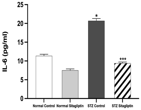 As shown in Figure 2, the expression of IL-6 in the STZ control group (p < 0.05) was significantly higher than that in the normal control and normal sitagliptin groups. The significant elevation of serum IL-6 levels in the STZ control group was alleviated with sitagliptin treatment in the STZ sitagliptin group (p < 0.001) (Table S1 (G)).