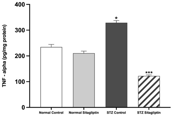 As shown in Figure 3, the plasma level of TNF-α was markedly higher in the STZ control group than that in the normal control (p < 0.05). However, TNF-α levels significantly decreased after sitagliptin treatment in the STZ sitagliptin group compared to those in the STZ control group (p < 0.001) (Table S1 (H)).