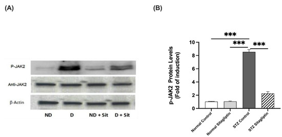 As illustrated in Figure 4, the expression of P-JAK2 was significantly higher in the diabetic groups than that in the non-diabetic groups (p < 0.001), whereas that in the STZ control group was the highest. Sitagliptin administration significantly decreased the expression of P-JAK2 in the STZ sitagliptin group compared to that in the STZ control group (p < 0.001) (Figure S1) (Table S1 (I)).