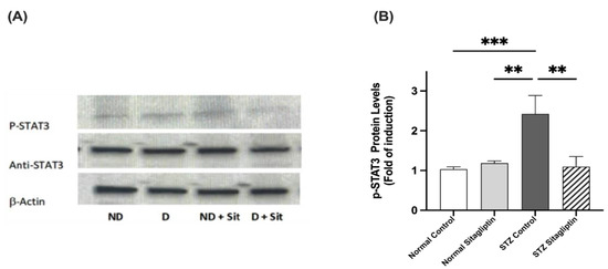As illustrated in Figure 5, the expression of P-STAT3 in the diabetic control group was significantly higher than that in the non-diabetic control and sitagliptin-only non-diabetic groups (p < 0.001 in both). The expression of P-STAT3 in the diabetic group treated with sitagliptin was markedly downregulated compared to that in the diabetic control group (p < 0.001) (Figure S1) (Table S1 (J)).