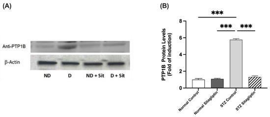 Immunoblot data showed a significant increase in PTP1B expression in STZ-induced diabetic rats compared with non-diabetic rats (p < 0.001). As shown in Figure 6, PTP1B expression in diabetic rats treated with sitagliptin was significantly reduced compared to that in the diabetic control group (p < 0.001) (Figure S1) (Table S1 (K)).