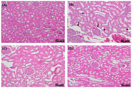 Kidney biomarkers (blood urea nitrogen (BUN), creatinine, and urea) in serum samples were determined using specific rat ELISA kits according to the manufacturer’s specifications. With regard to albumin, creatinine, and urea assays, the incubation of 50 µL of all standards or samples was performed for 2 h at 37 °C. Washing of the wells was conducted to ensure that all unbound substances were removed, followed by the addition of 50 µL of the chosen primary detector antibody to every well and then further incubation for 1 h at 37 °C. Afterward, 50 µL of the HRP-conjugated secondary antibody was added to each well and incubated for 1 h at 37 °C. Subsequently, 100 µL of conjugated development solution was introduced to each of the wells and incubated in the dark for 30 min at 37 °C. Finally, 100 µL of stop solution was added to each well, and the absorbance was recorded at 450 nm using a microplate reader (BioTek Instruments, Winooski, VT, USA). The concentrations in the samples were calculated using a standard curve following the assay kit instructions.