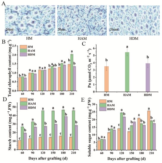 Effect of different interstocks on photosynthetic related physiological indicators of grafted ‘Mingrijian’ seedlings leaves. (A) Microscopy of stoma from plants after 210 days, (B) total chlorophyll, (C) Pn, (D) starch content and (E) soluble sugar content. Data were the mean ± standard error of three replicates. Error bars indicate the standard error, and different letters indicate significant differences, p < 0.05.