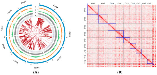Overview of chromosome scale in P. grandiflorum. (A) Circos plot of the nine pseudo-chromosomes. The outermost track (light blue) indicates nine pseudo-chromosomes. The a–d track shows the distribution of genes (a, orange), repeat distribution (b, green), GC contents (c, gray), and GC skew (d, blue) in non-overlapping 100 kb sliding windows. The innermost lines (red) indicate collinear blocks identified within the pseudo-chromosomes. (B) Heatmap of Hi-C assisted assembly. Blue box indicates higher contact probability.