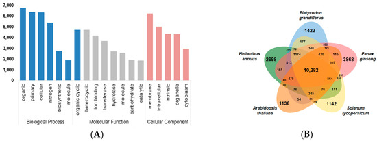 Gene distribution of P. grandiflorum. (A) Gene ontology (GO) classification of genes. The 17,286 genes assigned to GO terms were classified in functional categories based on GO terms at level 3. The Y-axis is the number of genes. (B) Shared and unique gene clusters in P. grandiflorum and four related species. Venn diagram illustrating the number of shared and unique gene clusters among P. grandiflorum (Korean bellflower), P. ginseng (Korean ginseng), H. annuus (sunflower), S. lycopersicum (tomato), and Arabidopsis thaliana.
