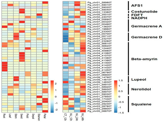 To reveal the expression profile of P. grandiflorum, RNA-Seq data identified a gene expressed in at least one of eight different tissues and one of three methyl jasmonate (MJ) treatments. To identify the genes related to triterpenoid saponins in P. grandiflorum, 46 candidate genes were identified to be involved in the triterpenoid biosynthesis pathway using the KEGG database (Figure 3). Triterpenoids are generated by OSCs that catalyze the production of diverse triterpene skeletons [24], and β-amyrin synthases are important OSCs for triterpenoid saponin biosynthesis [27]. Therefore, the existence of 14 beta-amyrin (β-amyrin) synthases is evidence of their major contribution to triterpenoid saponin modifications in P. grandiflorum. Most β-amyrin genes were strongly expressed in roots and seeds (Figure 3). Among the fourteen β-amyrin genes, three genes (Pg_chr02_56820T, Pg_chr04_41420T, and Pg_chr04_41430T) showed significantly higher expression in root tissues under normal conditions (Supplementary Table S12), suggesting they are key genes associated with the production of triterpenoid saponins in the roots of P. grandiflorum. However, two β-amyrin genes (Pg_chr04_41450T and Pg_chr04_41400T) significantly expressed in roots were not selected as key genes because of their relatively low expression in roots with the absence of expression in other tissues.
