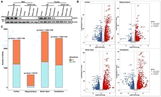 To investigate the role of DAPK1 in global gene expression changes, RNA sequencing (RNA-seq) was performed in different brain tissues, including the cerebral cortex, hippocampus, brain stem, and cerebellum, in male and female DAPK1-KO and WT mice. DAPK1 expression was distributed in all four brain regions in WT mice, although the expression level of DAPK1 in the cerebellum was lower than that in the other brain regions for both males and females. However, DAPK1 was not expressed in the brain tissues of either male or female DAPK1-KO mice (Figure 1A). DEGs analyzed by the R software ‘limma’ package (v3.28.14) and ‘edgeR’ package (v3.14.0) are shown in Supplemental File S1. Moreover, DEGs by overlapping these two methods are shown in Supplemental File S2. The analysis of DEGs by a volcano plot revealed that 2445, 657, 2870, and 2527 genes were significantly altered in the cerebral cortex, hippocampus, brain stem, and cerebellum of male DAPK1-KO mice, respectively (Figure 1B for edgeR and Figure S1A for limma). Moreover, 1940, 881, 1931, and 2539 genes were significantly altered in the cerebral cortex, hippocampus, brain stem, and cerebellum of female DAPK1-KO mice, respectively. (Figure S2). In addition, the number of regulated genes, including upregulated genes and downregulated genes, for each type of brain tissue is shown in Figure 1C and Figure S1B for males and females, respectively. As the data showed, the number of upregulated genes was more than that of downregulated genes, especially in the hippocampus. Interestingly, the hippocampus showed the lowest number of DEGs for both males and females (Figure 1C and Figure S1B). Moreover, the fold-change was lower in the hippocampus than in the other brain regions.