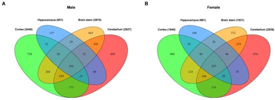 To further identify the common and unique DEGs in the tissues from four brain regions, we analyzed the DEGs by Venn diagram. The overlap of all DEGs for males and females is shown in Figure 3A,B. We found that most of the DEGs were unique to the cerebellum. Moreover, the figure shows that 354 and 557 DEGs were common in the tissues from all four brain regions for males and females, respectively. Moreover, 934 and 567 genes were significantly dysregulated in the tissues of at least three brain regions for males and females, respectively. Interestingly, the cerebral cortex, brain stem and cerebellum had the highest number of common DEGs when comparing the number of shared DEGs within all four brain regions. Furthermore, the hippocampus tissue showed the lowest number of DEGs (657 genes for males and 881 genes for females), almost all of which (~54% for males and ~63% for females) were shared with the tissues from the other brain regions. Detail information of Venn diagram is shown in Supplemental Files S3 and S4 for males and females, respectively.