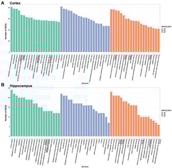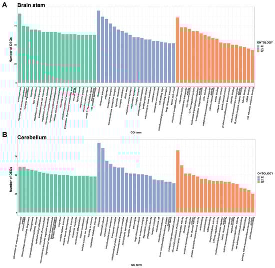 Gene ontology enrichment analysis of the DEGs in the brain stem (A) and cerebellum (B) of male DAPK1-KO mice. The GO categories were biological process (BP), cellular component (CC), and molecular function (MF).