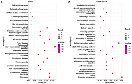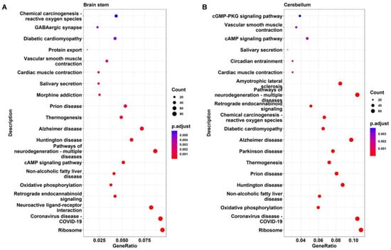 KEGG analysis was applied to further identify the important pathways associated with the DEGs. The top 20 significantly enriched pathways in DAPK1-KO mice compared with WT mice for males and females are depicted in Figure 6, Figure 7, Figures S7 and S8, respectively. The KEGG analysis revealed that several pathways, including ribosome-related, coronavirus disease 2019 (COVID-19), age-associated, nonalcoholic fatty liver disease (NAFLD), and oxidative phosphorylation pathways were significantly enriched in the cerebral cortex, brain stem, and cerebellum, but not in the hippocampus. Similarly affected were many neurodegenerative disease-related pathways, such as AD, PD, and HD. COVID-19 was the most significantly enriched KEGG pathway in the cerebral cortex, brain stem, and cerebellum, with 69, 81, and 75 related genes for DAPK1-KO males (49, 52, and 75 DEGs for DAPK1-KO females), respectively. Moreover, the main enriched pathways in the hippocampus were endocrine-related pathways, such as morphine addiction, salivary secretion, and parathyroid hormone synthesis, secretion, and action. We also found that circadian entrainment and synapse-related pathways, including glutamatergic synapses and GABAergic synapses, were significantly enriched in almost all tissues. Consistent with the number of DEGs and GO terms, the number of significant KEGG pathways was smaller in the hippocampus than those in other brain regions, especially the female hippocampus. However, the types of KEGG pathways enriched in males and females were similar in each brain region. Detailed information of KEGG pathway analysis is shown in Supplemental File S5.