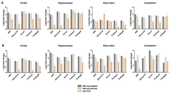 To confirm the expression of DEGs by RNA-seq, we selected five of the most upregulated genes overlapping in four brain regions for both males and females and performed qRT-PCR with three independent samples. AF4/FMR2 family member 2 (Aff2), zinc finger with KRAB and SCAN domains 16 (Zkscan16), potassium voltage-gated channel subfamily A member 1 (Kcna1), protocadherin alpha subfamily C, 2 (Pcdhac2), and protocadherin gamma subfamily A, 8 (Pcdhga8), which are upregulated in the tissues of all four brain regions for both males and females, were selected and analyzed. The RNA-seq data showed that the expression of Aff2, Zkscan16, Kcna1, Pcdhac2, and Pcdhga8 in the cerebral cortex of male DAPK1-KO mice was increased by 24.5 (by edgeR method, 24.1 by limma method), 24.0 (by edgeR method, 24.1 by limma method), 24.8 (by edgeR method, 24.8 by limma method), 24.3 (by edgeR method, 24.2 by limma method), and 24.2 (by edgeR method, 23.9 by limma method) fold changes, compared with that of WT mice, respectively. The data are shown in column ‘logFC’ in Supplemental File S1. Consistently, the results from the qRT-PCR experiment showed that the expression levels of Aff2, Zkscan16, Kcna1, Pcdhac2, and Pcdhga8 were increased by 22.6-, 21.5-, 24.2-, 22.7-, and 22.9-fold, respectively, in the cerebral cortex of male DAPK1-KO mice compared with those of WT mice (Figure 8A). Although the levels of gene expression from qRT-PCR were different compared with those determined in the RNA-seq data, the upregulation pattern was the same in all brain regions for both males and females (Figure 8A,B).