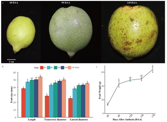 Fruit morphological characteristics during iron walnut development. (a) Morphology of iron walnut fruits at the rapid growth period (0–60 DAA), the endocarp hardening period (61–90 DAA), and the fruit maturation period (91–170 DAA). (b) The length, transverse diameter, and lateral diameter of fresh iron walnut fruit from 60 to 170 days after anthesis (DAA). (c) The weight of fresh iron walnut fruit from 60 to 170 DAA. Different letters indicate significant differences.